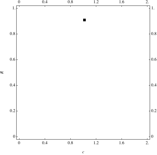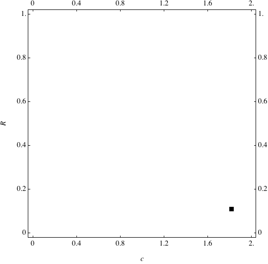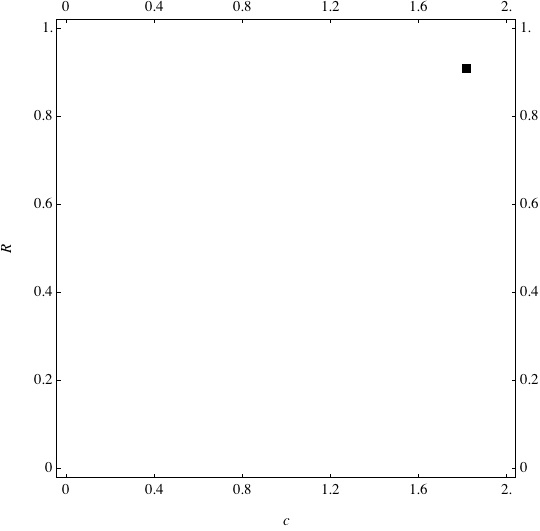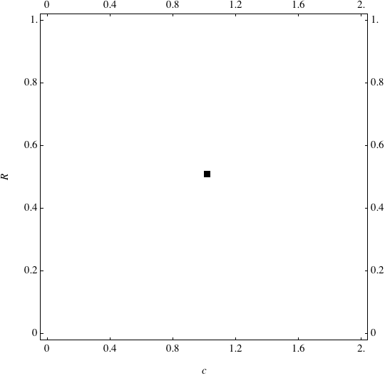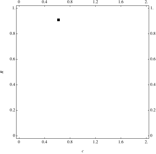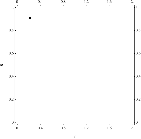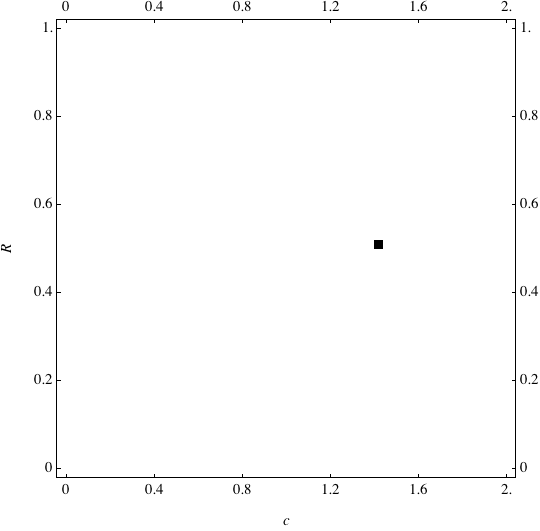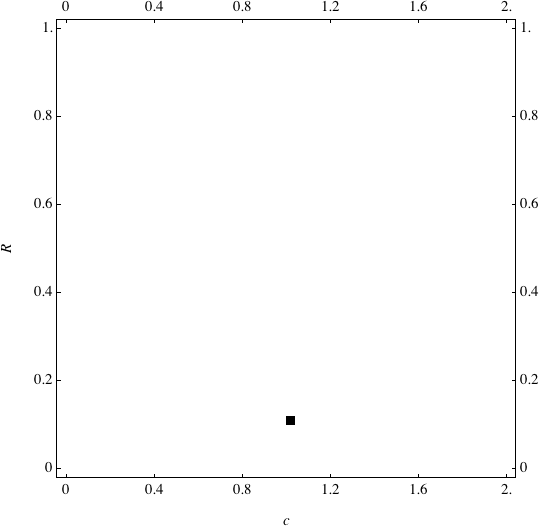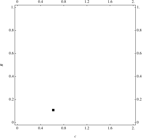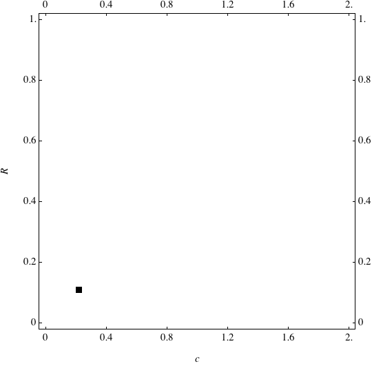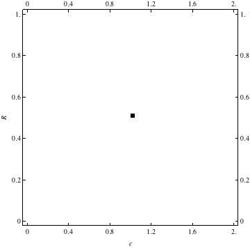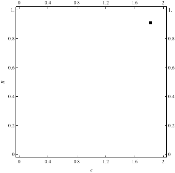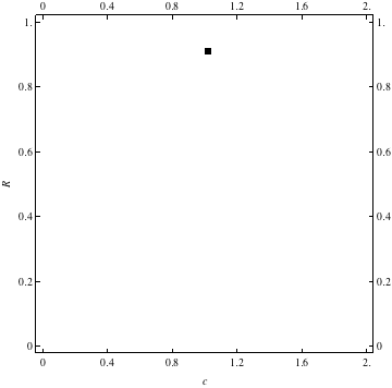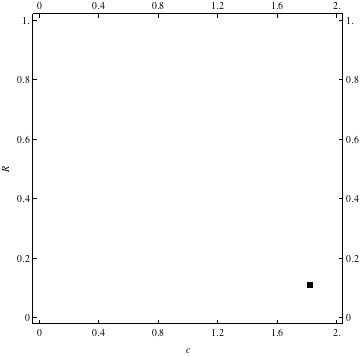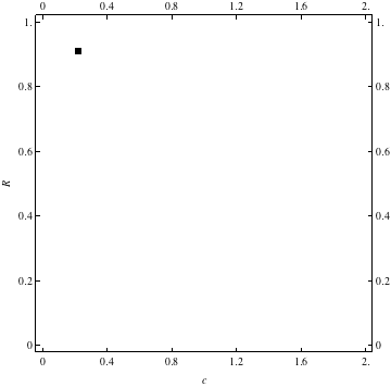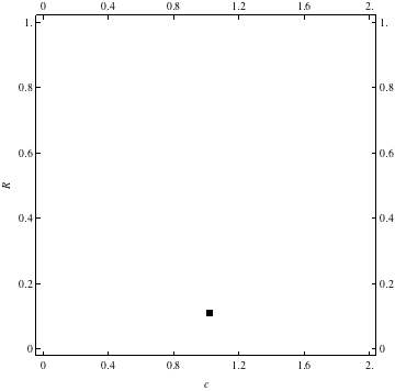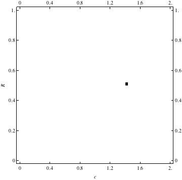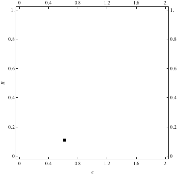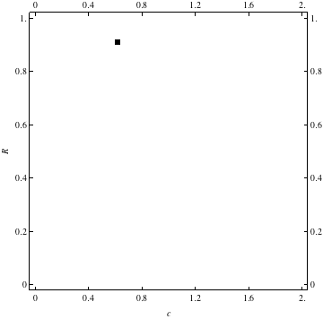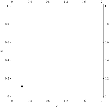 These are examples of evolutionary trajectories of the coevolution of the probability of global reproduction (R: vertical axis, 0 <= R <=1) and the level of cannibalism (c: horizontal axis, 0<=c <= 2).